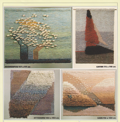 Seuraavissa kuvissa muutamia Eija Rasinmäen Design tuotteita. Ensimmäisessä kuvassa hänen suunnittelemissaan seinätekstiileissä on materiaalina puuvillakude ja pellavalanka.